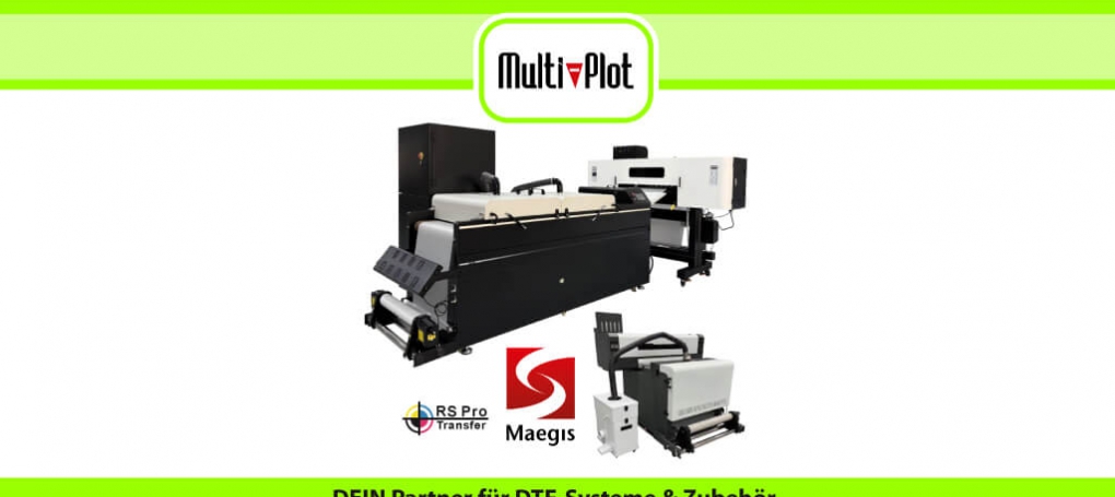 „Eine wichtige und notwendige Ergänzung“, wie Joachim Rees kommentiert. Das holländische Unternehmen Maegis unterstützt das Team von Multi-Plot in vollen Zügen und liefert alles rund um Direct-to-Foil. Der DTF-Transfer-Druck bietet ein einfaches und kostengünstiges Verfahren zur Veredelung von Kleidungsstücken, insbesondere T-Shirts. Der Bad Emstaler Digitaldruck-Spezialist bietet nun die RS Transfer Pro Serie an, die in unterschiedlichen Ausführungen erhältlich ist. Beispielsweise gibt es die RS Transfer Pro 300T. Mit diesem System lassen sich hochwertige Textiltransferdrucke mit einer Druckbreite von bis zu 37 cm produzieren. Ausgestattet ist das RS Transfer Pro Drucksystem mit folgenden Komponenten: 2x EPSON i3200-Druckköpfen, Hot-Melt-Beschichtungssystem, Trockentunnel mit doppeltem Trocknungssystem, Druckkopfschutz (Anti-Crash-System), motorisierte Capping-Station gegen das Eintrocknen der Druckköpfe, präzise Temperatureinstellung über Touchscreen. Auch vergleichbare Systeme mit Transferbreiten von 60 cm sind erhältlich. Die Textiltransferdrucke sind flexibel, dünn und haben eine edle Haptik. Durch die Verwendung von wasserbasierenden Pigmenttinten handelt es sich zudem um eine umweltfreundliche Lösung. Die Vielzahl an Textilien, die bedruckt werden können, ist enorm, z.B. Baumwolle, Polyester, Jeans oder Kunstleder. Für alle Anwendungen sind die gleiche Tinte und der gleiche Pulverschmelzkleber verwendbar und kompatibel, es ist kein Wechsel notwendig. Generell ist der Arbeitsablauf der RS Transfer Pro Serie so zu beschreiben; spiegelbildlich wird das Motiv auf eine transparente PET-Folie gedruckt. Damit der Transferdruck deckend ist, wird nach dem 4-Farb CMYK-Druck (je nach Modell auch bis zu 8 Farben möglich) im gleichen Arbeitsgang über den 2. Druckkopf weiße Tinte aufgebracht. Die bedruckte Folie durchläuft dann einen Pulverbeschichter, in dem der Pulverschmelzklebstoff auf die Folie aufgetragen wird und auf der noch etwas feuchten Tinte haftet. Im nächsten Schritt durchläuft die Folie den Trockenkanal, anschließend wird das fertige Produkt automatisch auf einen Rollenkern aufgewickelt. Ein weiteres System, was ebenfalls nun zum Multi-Plot Sortiment zählt, ist die Druckmaschine RS Pro DTF UV. Diese Maschine ist mit drei Epson 3200 UV Druckköpfen ausgestattet (CMYK, weiß, Lack) und druckt bis zu einer Breite von 60 cm mit UV-Tinte auf Film (Film mit Leim). Nach dem Druck wird die Klebefolie automatisch abgezogen und im Anschluß automatisch mit Gummiheizwalzen laminiert. Mit diesem UV Drucker lassen sich kratzfeste Aufkleber ohne zeitaufwendiges Schneiden und Entgittern im Handumdrehen drucken und verarbeiten.